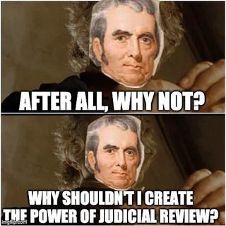 Consider a few crucial examples of our little-c constitution that aren’t part of our big-C Constitution. First, and most importantly, is the Supreme Court’s ability to declare laws unconstitutional. As a child, I learned that the Founding Fathers designed a government with three branches that had checks and balances against each other. This is a post hoc explanation. The Supreme Court’s ability to strike down Congress’s and states’ laws as unconstitutional is nowhere in the Constitution, not in the original text and not in any amendments. The Supreme Court itself decided, in a Supreme Court case, that it could declare laws unconstitutional, 14 years after the Constitution was ratified. The Court had to be clever about getting this decision enforced, navigating a conflict between political parties, coming to a decision that the party in power wanted to enforce, but for reasons that strengthened the Court. It was, in a sense, a mini-coup.
