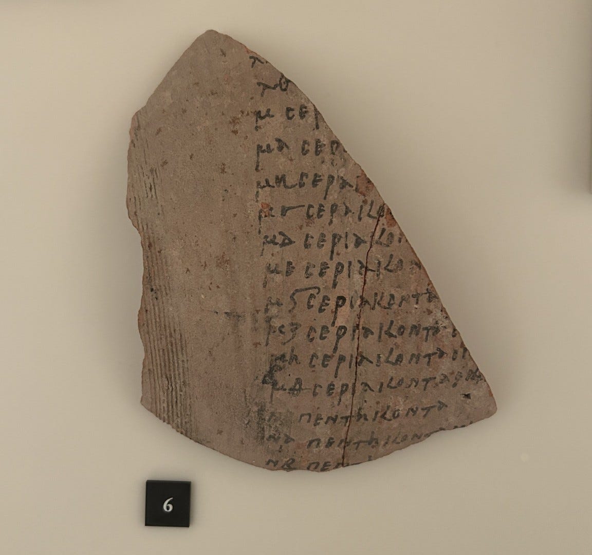 Display the most educational pieces, not the “best” or most beautiful. One of my favorite pieces on my Berlin trip was a broken pottery shard from Hellenistic Egypt with writing on it. This piece is not beautiful or, I imagine, particularly interesting for a professional archaeologist. But to me, it is such a wonderful piece. The writing shows a counting exercise, one number per line, starting with “39 thirty-nine” and ending with “52 fifty-two.” You see the human effort required to learn handwriting, alphabets, and numerals. You see first hand how pottery shards were “scrap paper” at a time when paper (well, papyrus) was rare and broken pottery was ubiquitous. This one unremarkable piece can teach so much about language, the scribal profession, and pottery.