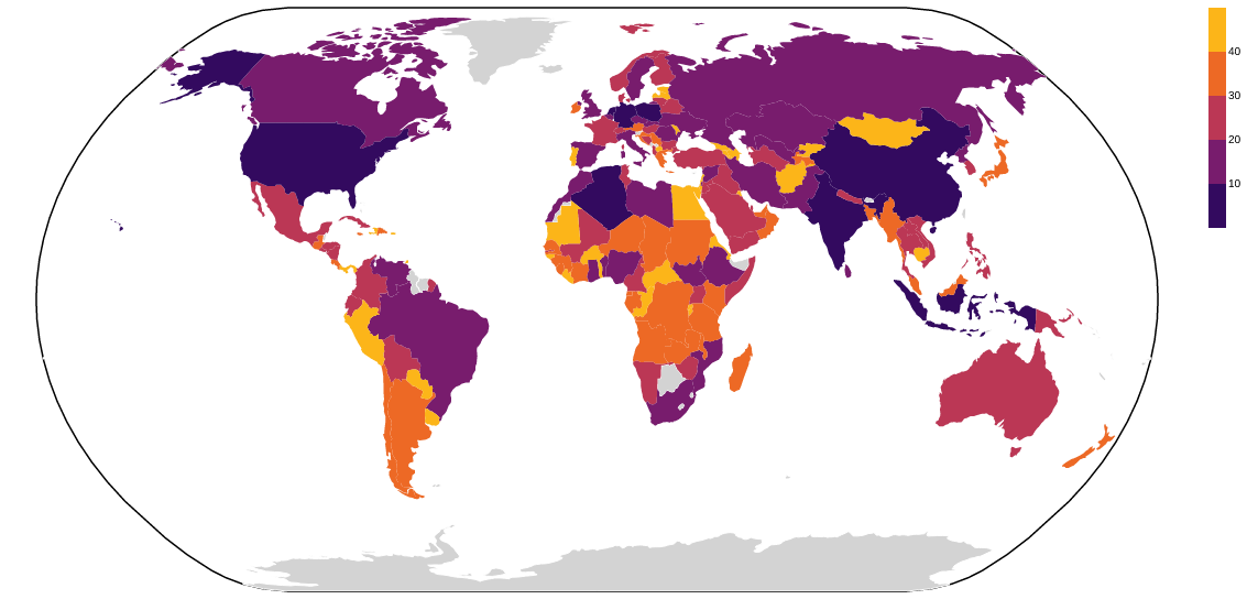As a first pass, I’ll use number of people as a proxy for amount of “interesting stuff,” and look at what percent of each country’s urban population lives in that country’s most populous city.