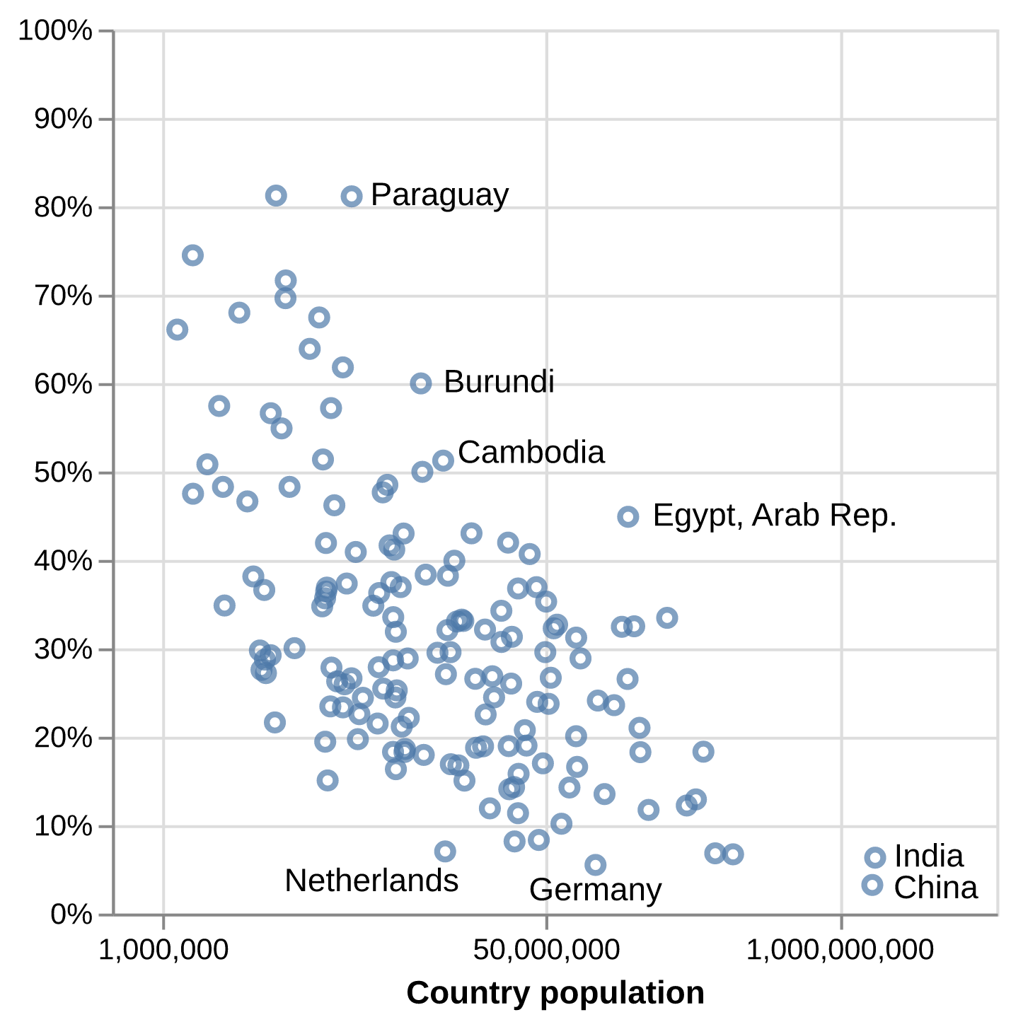 In general, total population is anticorrelated with this concentration. China and India clearly stand out on the big end. The United States and Indonesia are the points closest to China and India, with large, unconcentrated populations. Germany and the Netherlands have notably small concentrations, while Egypt is exceptionally concentrated (with Cairo being more than triple the size of Alexandria).2